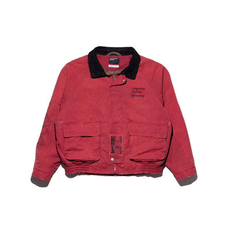ZIP FRONT JACKET IN JAPANESE COTTON CANVAS WITH COTTON FLANNEL LINING. BURNISHED GOAT LEATHER COLLAR. BELLOWS POCKETS AT FRONT. PRINTED ARTWORK AT FRONT, BACK, SLEEVE, & PATCHES. LOGO-BRANDED SNAP CLOSURE AT STORM FLAP IN FRONT AND AT WRISTS. ELASTIC AT WAISTBAND. DISTRESSING THROUGHOUT. MADE IN THE USA.