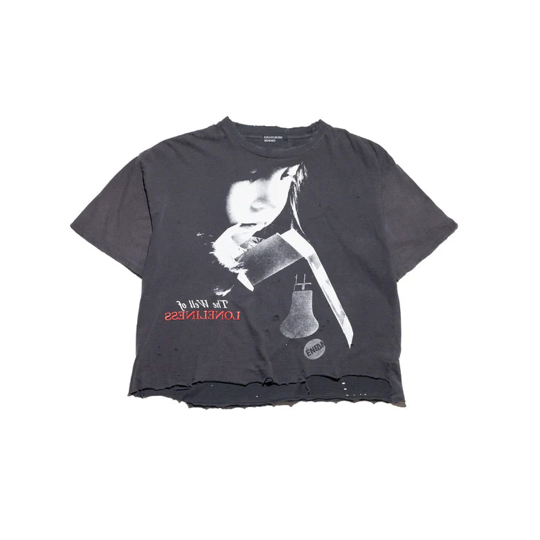 SHORT-SLEEVE T-SHIRT IN LIGHT WEIGHT VINTAGE TEXTURE COTTON JERSEY. BOXY FIT. RIB KNIT NECKLINE. SINGLE STITCH HEM AT WAIST AND CUFFS. PRINTED ARTWORK AT FRONT AND BACK. SIGNATURE VINTAGE WASH PROCESS. HEAVY DISTRESSING THROUGHOUT. MADE IN THE USA.