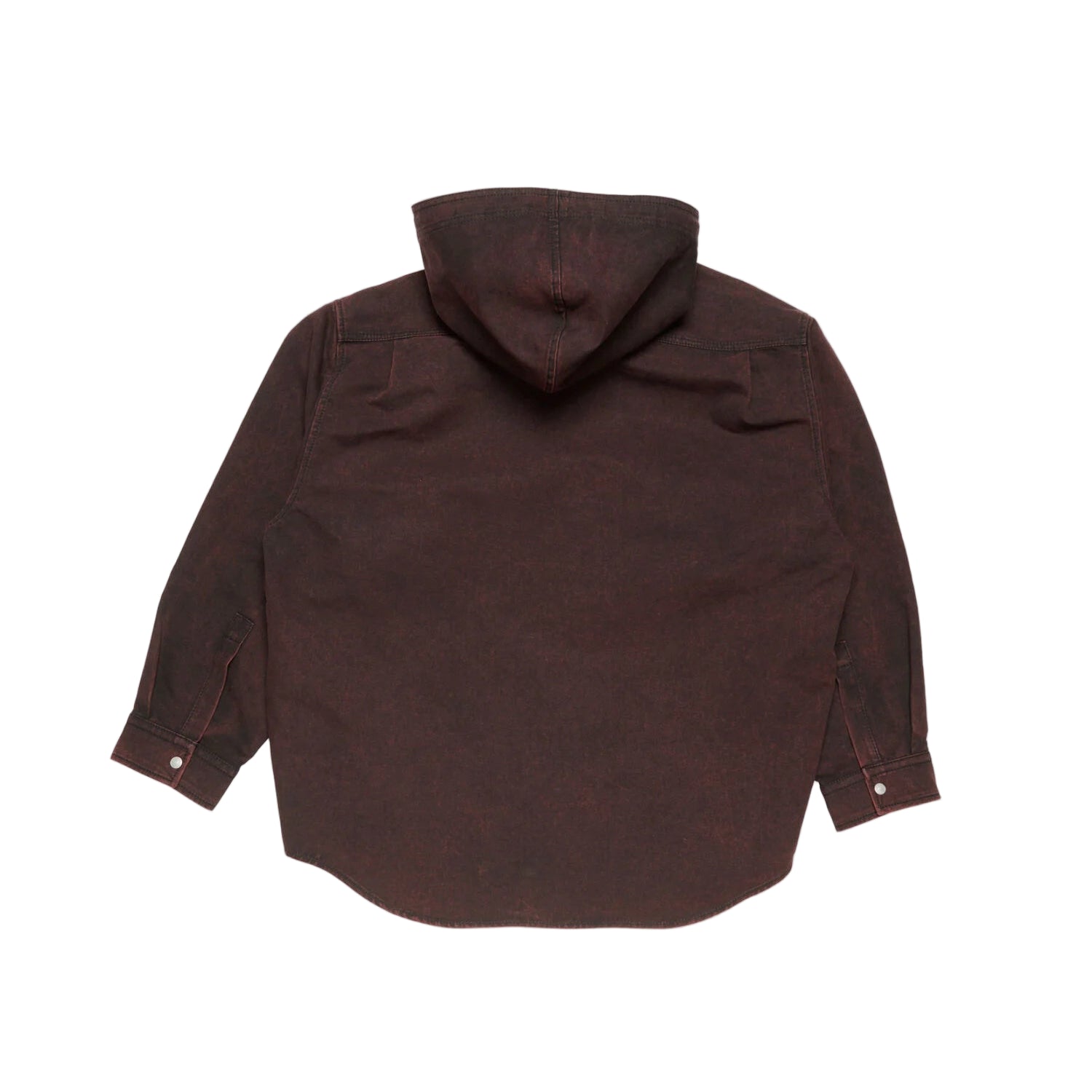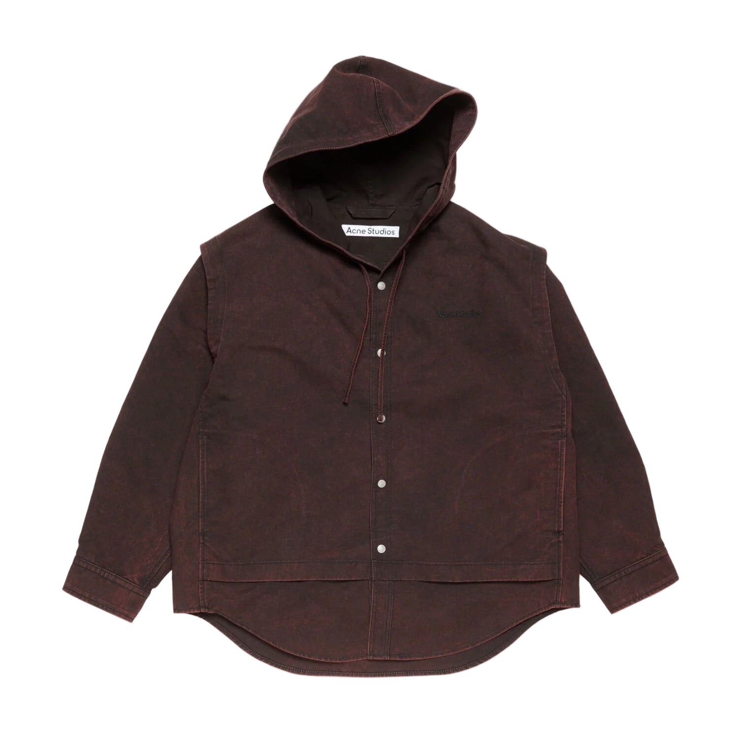 Hooded jacket with a layered construction, crafted from cotton satin with a peached finish and double-dyed for a textured look. Features an external drawcord, snap button closure, side seam pockets, and embroidered logo on the chest. Cut to a relaxed fit.