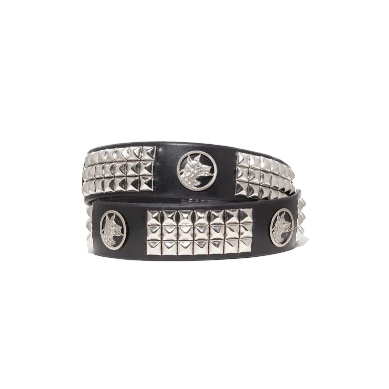 BELT IN HEAVY COWHIDE LEATHER. SIGNATURE WHITE BRONZE BUCKLE, LOOP, AND TIP. CUSTOM DOG COINS THROUGHOUT. HAND-STUDDING THROUGHOUT. MADE IN THE USA.