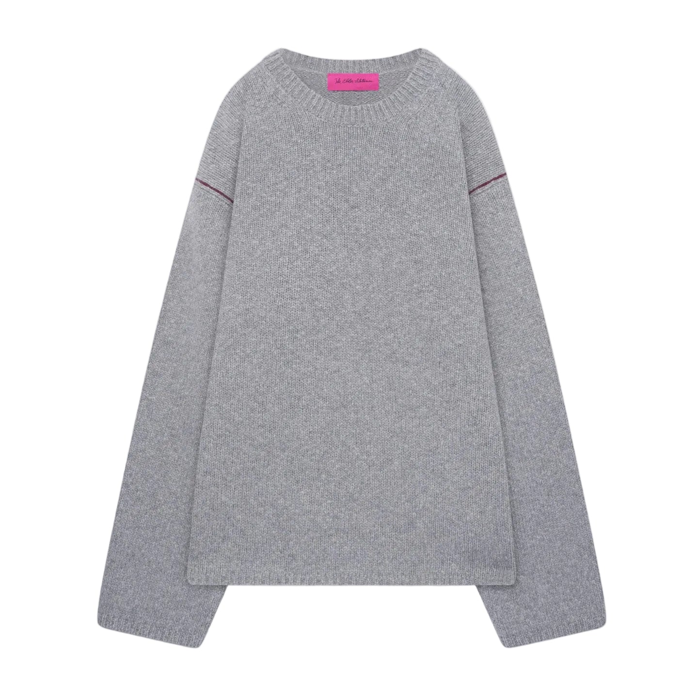 Mockneck pullover in heather grey cashmere with contrast port trim and roll-edge finish.