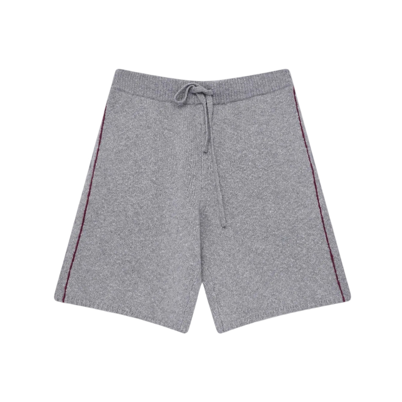 Relaxed cashmere shorts in heather grey with elastic waistband, drawcord tie, and side seam pockets.