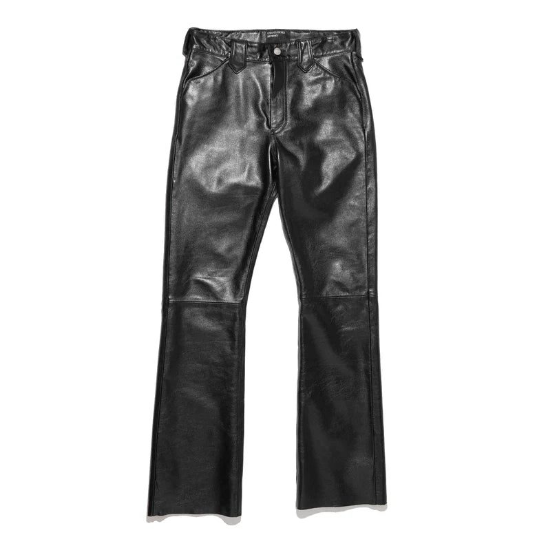 FLARE LEG PANTS IN TREATED DISTRESSED CALF LEATHER. VISCOSE TWILL LINING. ZIPPER FLY. WESTERN WIDE BELT LOOP AND YOKED FRONT POCKET. MADE IN ITALY.