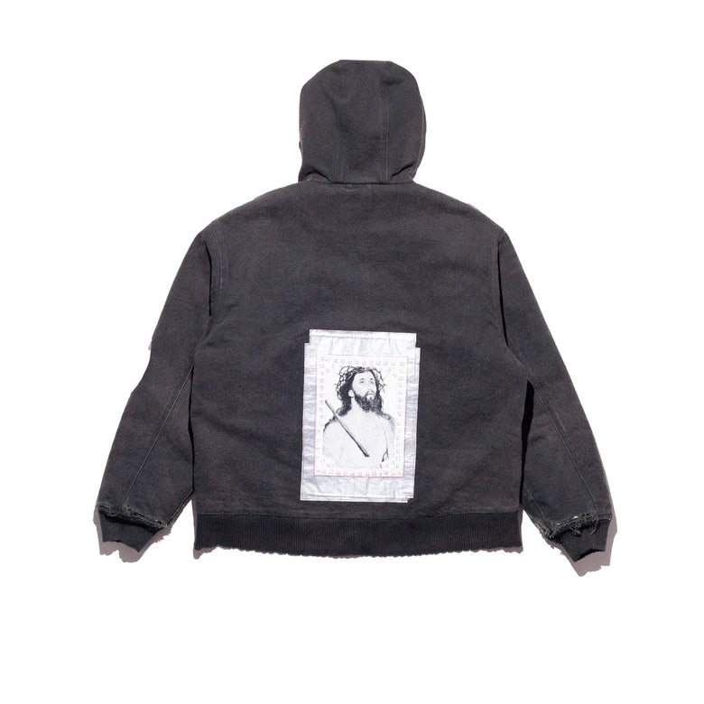 ZIP-FRONT HOODED WORK JACKET WITH DOWN QUILTED LINING. SPLIT PATCH POCKET ON FRONT. DUAL INTERIOR WELT POCKETS. PRINTED ARTWORK AT FRONT, BACK, SLEEVE AND PATCHES. CUSTOM SAFETY PIN HARDWARE ADORNMENT. DISTRESSING AND PATCHWORK REPAIRS THROUGHOUT. MADE IN USA.