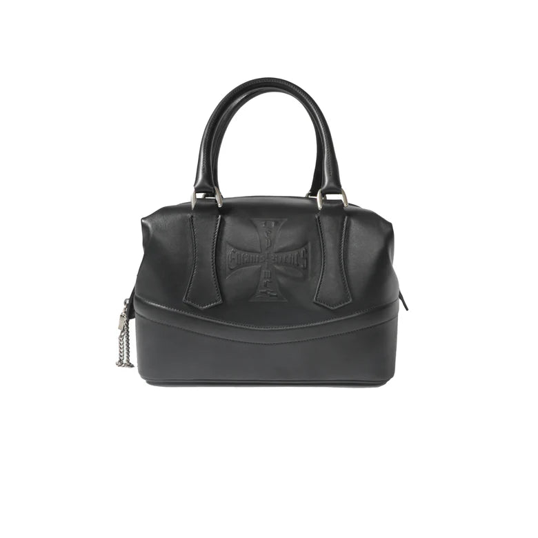 TOP-HANDLE BAG IN CALFSKIN LEATHER. TWIN ROLLED CARRY HANDLES. LOGO EMBOSSED AT FRONT. ZIP CLOSURE AT MAIN COMPARTMENT. CUSTOM LOCK AND KEY HARDWARE WITH CHAIN. MADE IN ITALY.
