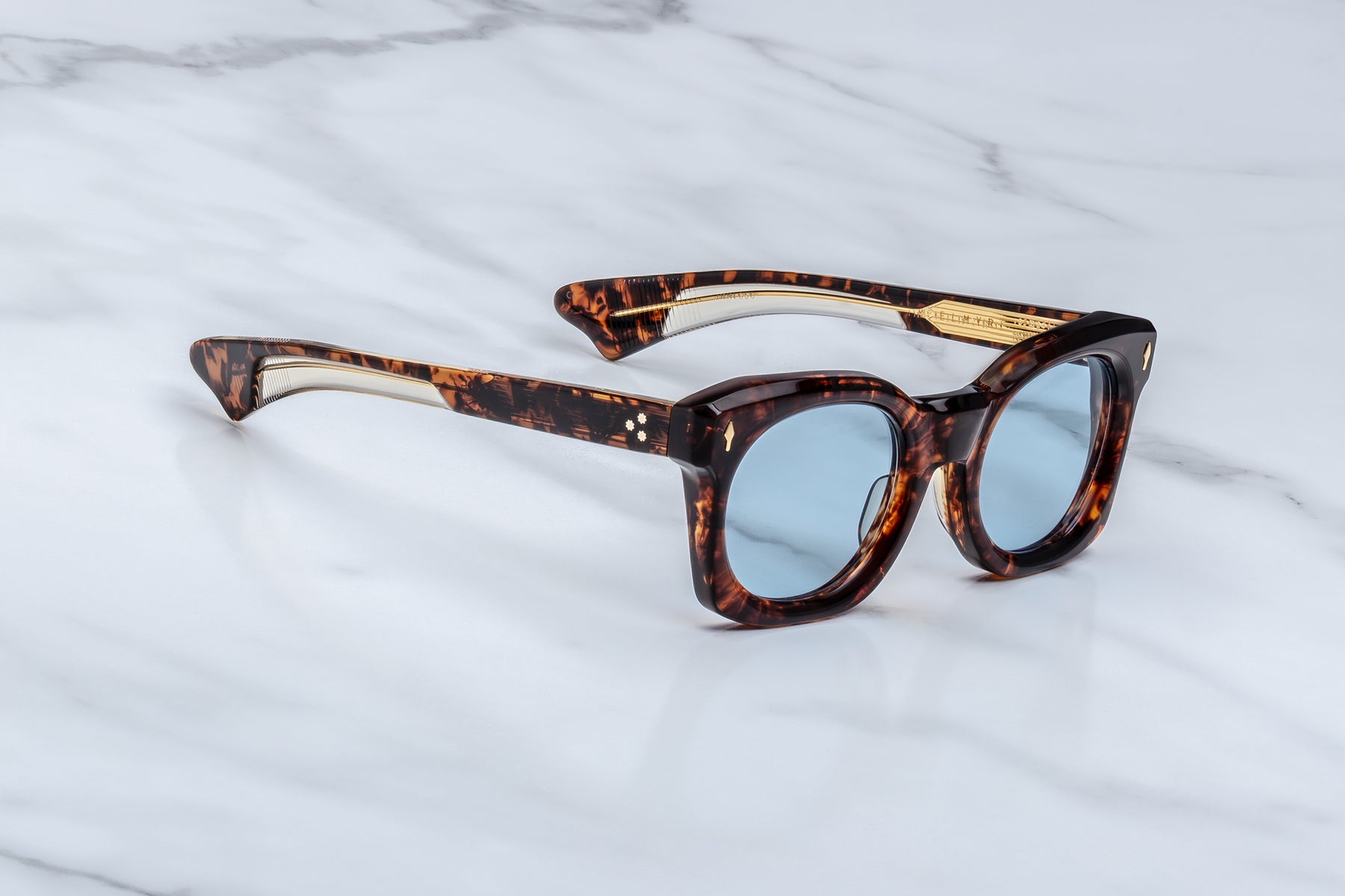 Unique, beautifully beveled ’70s-inspired spectacles offering a medium fit, featuring JMM's signature arrowhead front-pins, spur-shaped rivets, and ‘Classic’ wirecores with Art Deco-inspired hairline details.