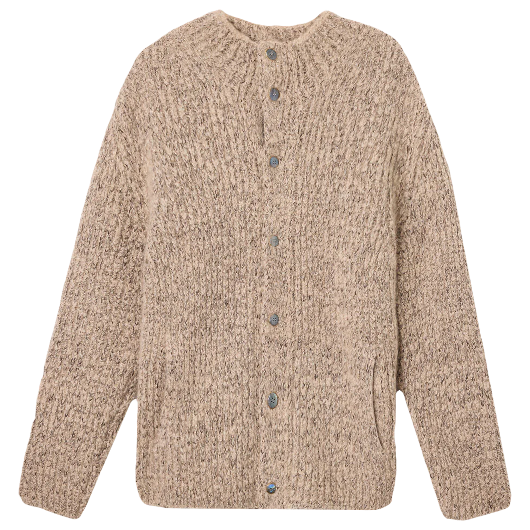 This cardigan features a chunky weight boucle cashmere yarn in a rib stitch and hidden vertical pockets. Gemstones adorn the front placket and neck trim.
