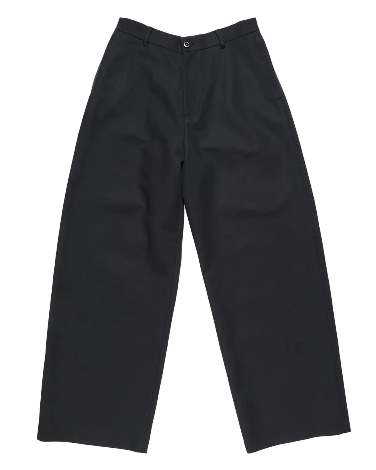 Trousers crafted from smooth cotton satin woven with a double structure for a round, classic hand. Complete with a zip closure, branded military buttons, and a leather logo patch at the back. Cut for a regular fit with a mid waist and long, loose legs.
