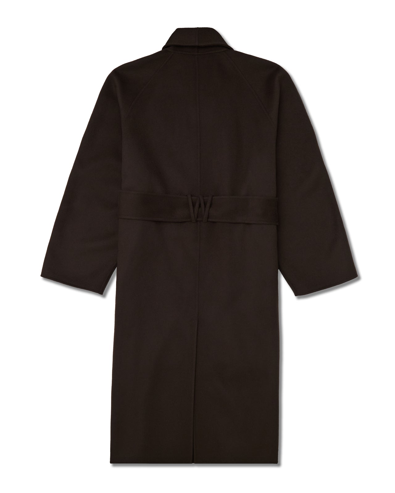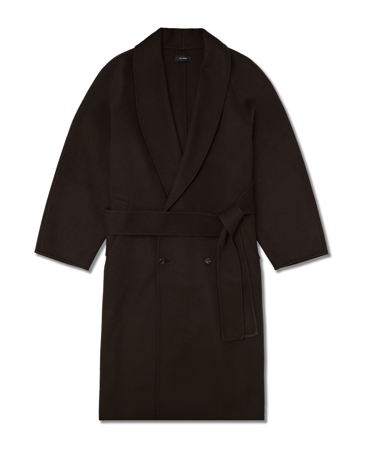 The Smoker’s Coat is a statement in craftsmanship, made from double-face fabric and hand-finished for exceptional quality. Featuring raglan sleeves, welted waist pockets, and branded button closures, it’s accented with a signature “W” belt loop at the center back and a removable belt. Its relaxed yet bold oversized fit brings modern ease to timeless tailoring.