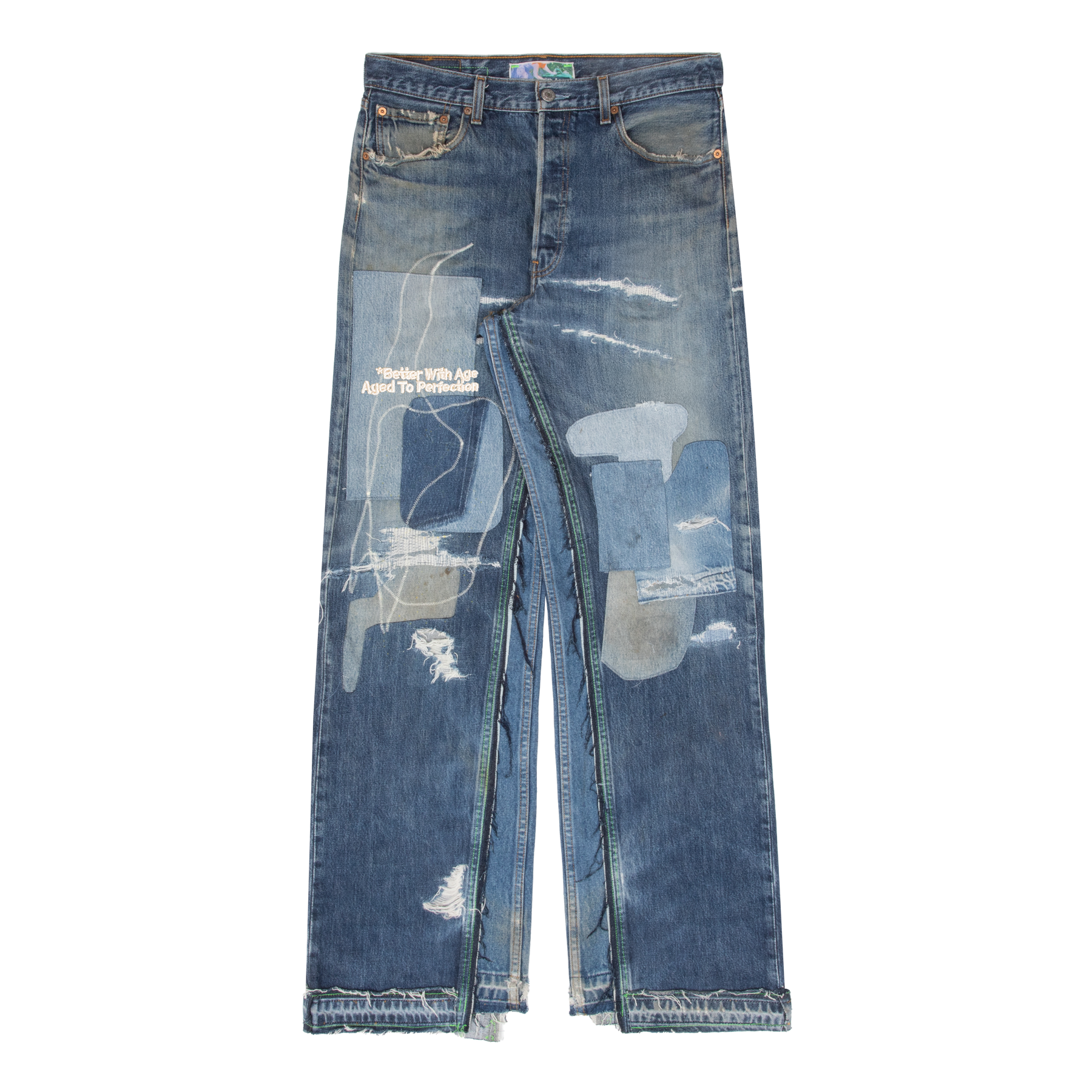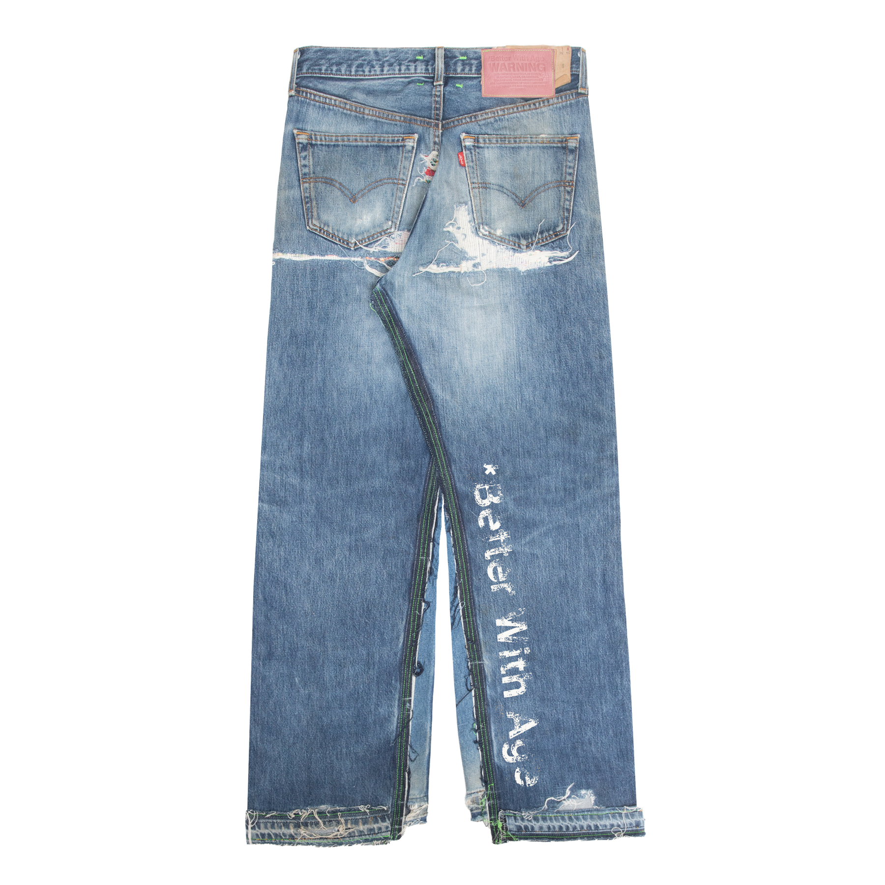 Buyer will receive a one-of-one pair of vintage repaired Levi's pants featuring embroidered and screen printed details. Length may vary. Wash may be lighter or darker than product images shown.